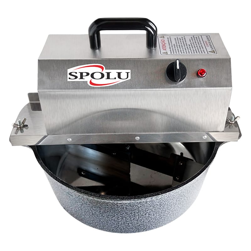 Sua função é misturar e mexer doces e salgados como: brigadeiro, beijinho, polenta e afins. A estrutura do cabeçote (motor) é toda em aço inox, com cabo anatômico em material anti chamas. Suas pás mexedoras são em silicone alimenticio e a estrutura em aço inox de 2,5 mm. A panela é em aluminio fundido e pintura externa eletrostática.