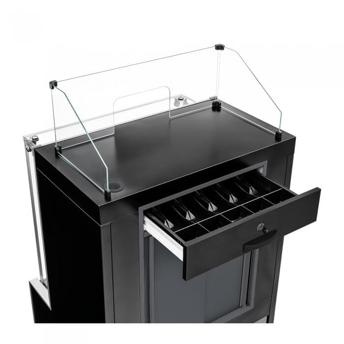• Gaveta com Fechadura: Ideal para armazenamento seguro, a gaveta possui fechadura, porta cédulas e divisórias para facilitar a organização.