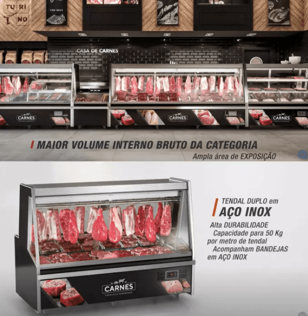 O BALCÃO DE AÇOUGUE TURINO STANDARD GELOPAR GATS-300D/PR COM DEPÓSITO apresenta um revestimento interno em aço inox 430, garantindo a máxima higiene e durabilidade. Equipado com um tendal duplo em alumínio com ganchos e laterais injetadas com vidro duplo low-E, este balcão oferece uma exposição atraente e segura para suas carnes, mantendo-as frescas e visíveis para seus clientes.