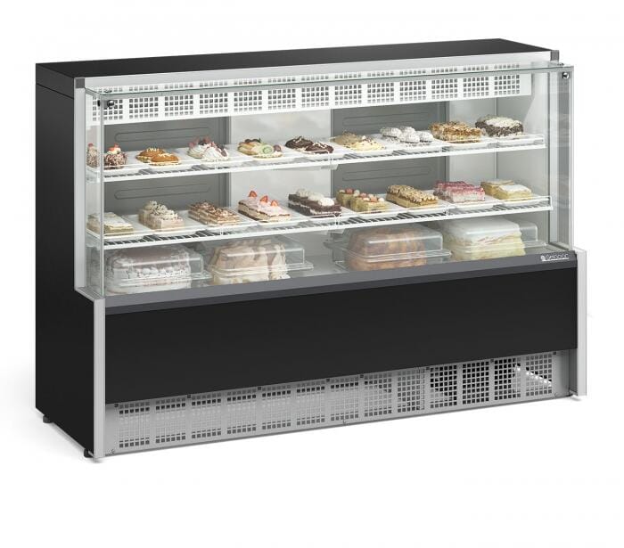 Uma ótima escolha para exposição de bolos, tortas, doces e confeitos ou bebidas, frios e laticínios em seu estabelecimento. Além do design moderno com vidros retos, ela é versátil com sua dupla função de temperatura, podendo armazenar bolos, tortas e doces ou bebidas. Para bolos, pode ser programada para funcionar entre +5ºC e +10ºC e para bebidas, entre +1ºC e +7ºC. Possui refrigeração estática com serpentina aletada e degelo manual, com temperatura controlada por termostato, além de prateleiras em 2 níveis, aramadas fixas. A iluminação é em LED com interruptor, deixando a vitrine muito mais elegante.