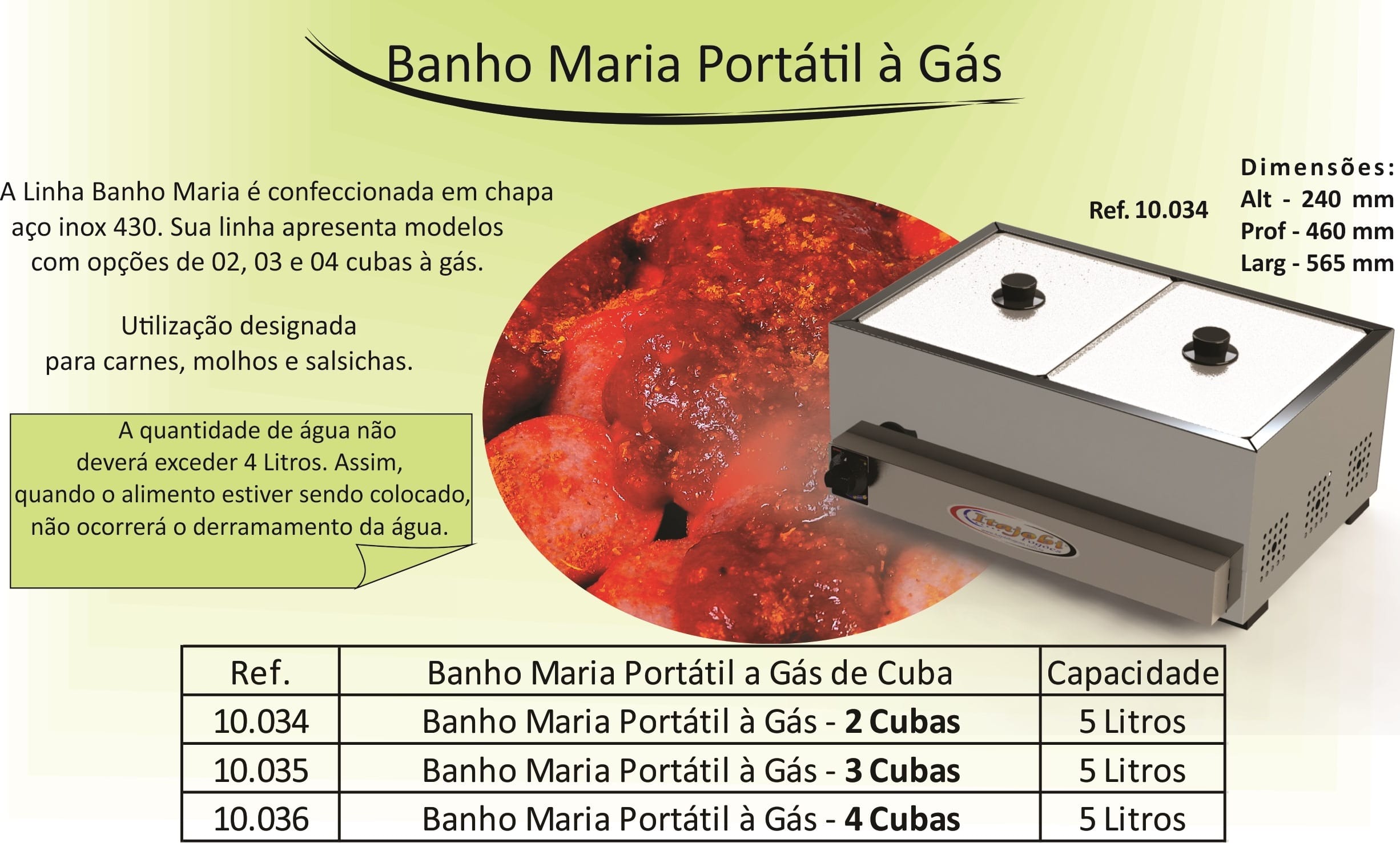 A linha de Banho Maria a Gás é confeccionada em chapa aço inox 430. Seu sistema de acendimento dos queimadores é realizado através de gaveta, o que garante maior segurança para o consumidor não se queimar ao acender o produto. Cada cuba do produto conta com 5 litros de capacidade, porém a quantidade de água nunca deverá exceder 4 litros, desta forma quando o alimento estiver sendo colocado não haverá o derramamento de água. Em opções de 2 a 4 cubas, o banho maria portátil a gás é designado para carnes, molhos e salsichas.