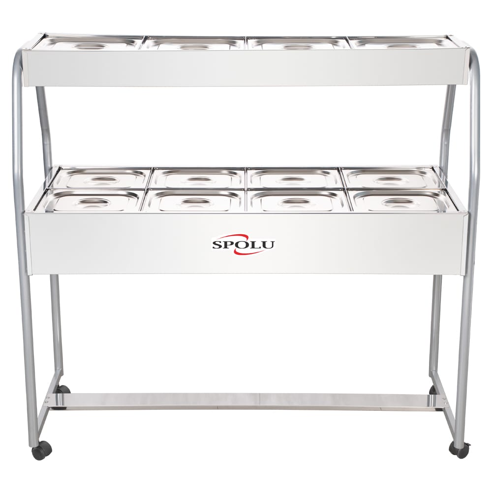 A função do Buffet térmico SPOLU é manter os alimentos servidos em suas cubas quentes enquanto em exposição. Possui cubas fabricadas em aço inox 201, tanque, tampas e moldura externa em aço inox 430 e estrutura de sustentação tubular. Sua resistência blindada é confeccionada em aço inox e controlada por um termostato com escala de 30ºC a 120ºC.