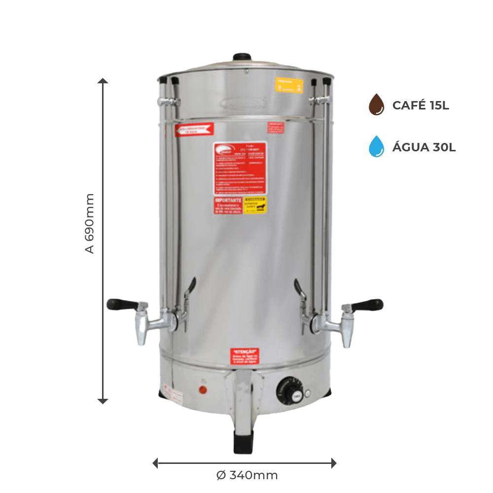 Toda fabricada em aço inox 430, com reservatório em aço inox 304 e acabamento em alto brilho, está disponível em dois modelos: 15 e 20 litros de café ou chá.