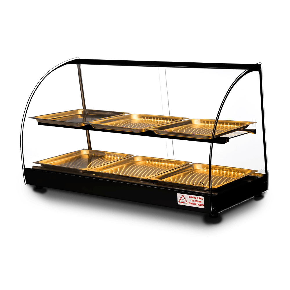 Estrutura fabricada em perfil de alumínio anodizado e aço inox; iluminação interna LED; prateleira de vidro temperado com iluminação; bandejas estampadas em aço inox;  vidros laterais com serigrafia, tratados termicamente (não solta com temperatura); termostato; resistência elétrica em aço inox 304 tubular; fiação elétrica com revestimento em silicone resistente a 300°C.