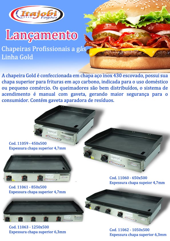 A linha de Chapeira Goldl é confeccionada em chapa aço inox 430 e possui sua chapa feita em chapa aço carbono com espessura grossa. Os queimadores são bem distribuídos e o sistema de acendimento padrão desta linha é manual através de gaveta, o qual gera maior segurança para o consumidor, além de serem individuais, ou seja o consumidor, se quiser, poderá acender apenas um lado do chapa. Os botões são fabricados em fibra de vidro, para resistir à alta temperatura. O produto possui gaveta do óleo removível, assim há uma grande facilidade em limpar. As chapeiras se encontram em vários tamanhos, são de baixa pressão e possuem a prensa como um opcional.