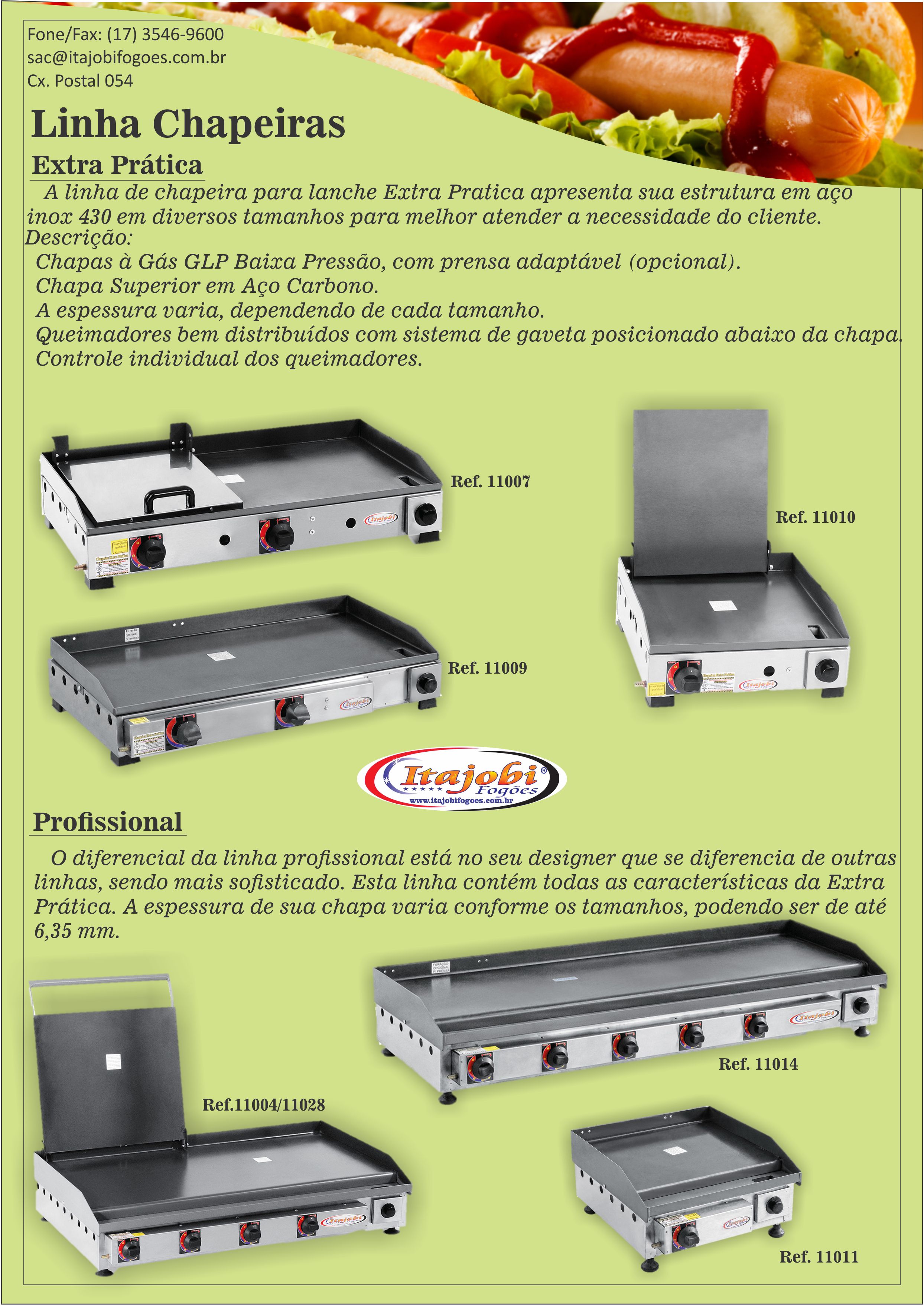 A linha de Chapeira Profissional é confeccionada em chapa aço inox 430 e possui sua chapa feita em chapa aço carbono com espessura grossa e possui um design mais sofisticado do que as outras linhas. Os queimadores são bem distribuídos e o sistema de acendimento padrão desta linha é manual através de gaveta, o qual gera maior segurança para o consumidor, além de serem individuais, ou seja o consumidor, se quiser, poderá acender apenas um lado do chapa. Os botões são fabricados em fibra de vidro, para resistir à alta temperatura e possuem 5 posições de acendimento. O produto possui gaveta do óleo removível, assim há uma grande facilidade em limpar. As chapeiras se encontram em vários tamanhos, são de baixa pressão e possuem a prensa como um opcional.