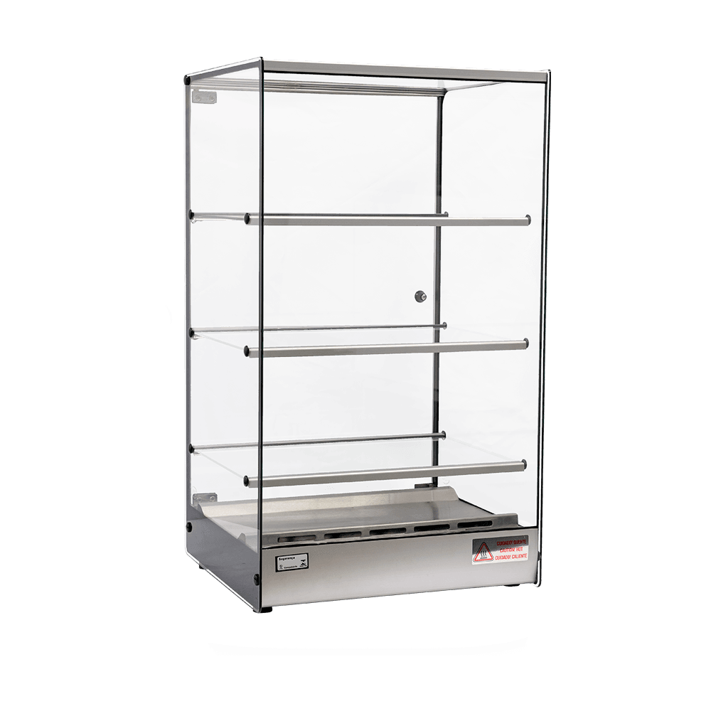 Estrutura fabricada em perfil de alumínio anodizado e aço inox; iluminação interna LED; prateleira de vidro temperado com iluminação; bandejas estampadas em aço inox; vidros laterais com serigrafia, tratados termicamente (não solta com temperatura); termostato; resistência elétrica em aço inox 304 tubular; fiação elétrica com revestimento em silicone resistente a 300°C.