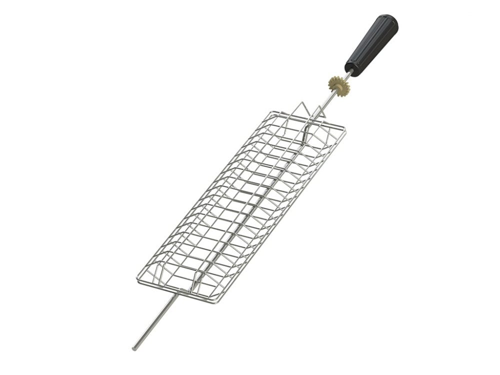 Espeto fabricado em aço inox 430 contendo um sistema de grelha que fecha para que a carne fique presa e girando automaticamente.