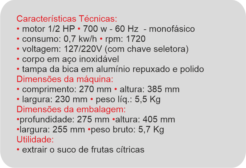 EXTRATOR DE SUCO 1/2 HP – BM 118 NR – BIVOLT BERMAR