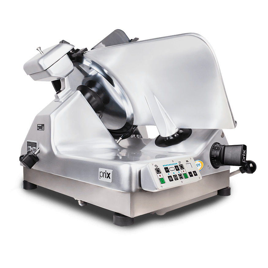 O fatiador de frios Prix Veloce 350A tem a movimentação totalmente automática, permitindo o fracionamento da peça enquanto o operador retira as fatias para montagem das bandejas que serão expostas.