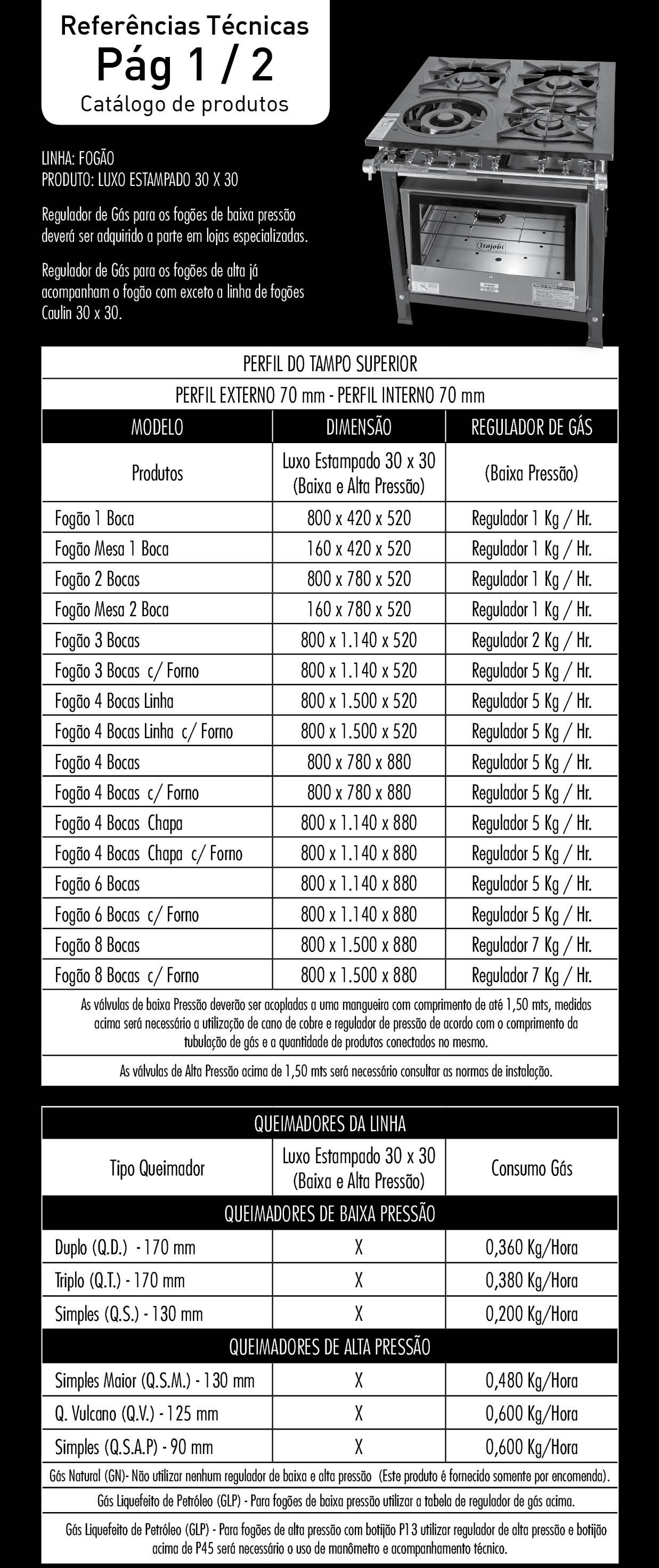 A linha de fogão Luxo Estampado 30×30 apresenta design diferenciado sendo confeccionada em chapa de aço carbono com pintura Epóxi ou em chapa aço inox 430. Seus queimadores são fabricados em ferro fundido nos modelos de Q. Simples, Q. Duplo e Q. Triplo, nos modelos de Baixa Pressão e Q. Simples, Q. Simples Maior e Q. Vulcano, nos modelos de Alta Pressão. As grelhas são confeccionadas em ferro fundido e apresentam o formato de 8 dedos, 30×30. Esta linha apresenta o tubo coletor de gás zincado, bandeja coletora de resíduos e opções de registro Torneira e Palito, fogões no modelo inox 430 o registro padrão é o Apís. Estes fogões apresentam modelos de 1 à 8 bocas com opção de forno, chapa e banho maria.
