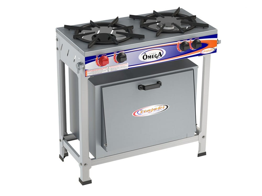 A linha de fogões Ômega é fabricada em chapa de aço carbono com pintura Epóxi na cor cinza clara. O tampo do fogão é fabricada em aço inox 430.