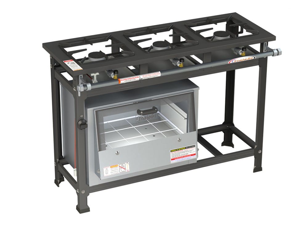 Estrutura do fogão em Chapa de aço carbono com pintura epóxi ou aço inox escovado.