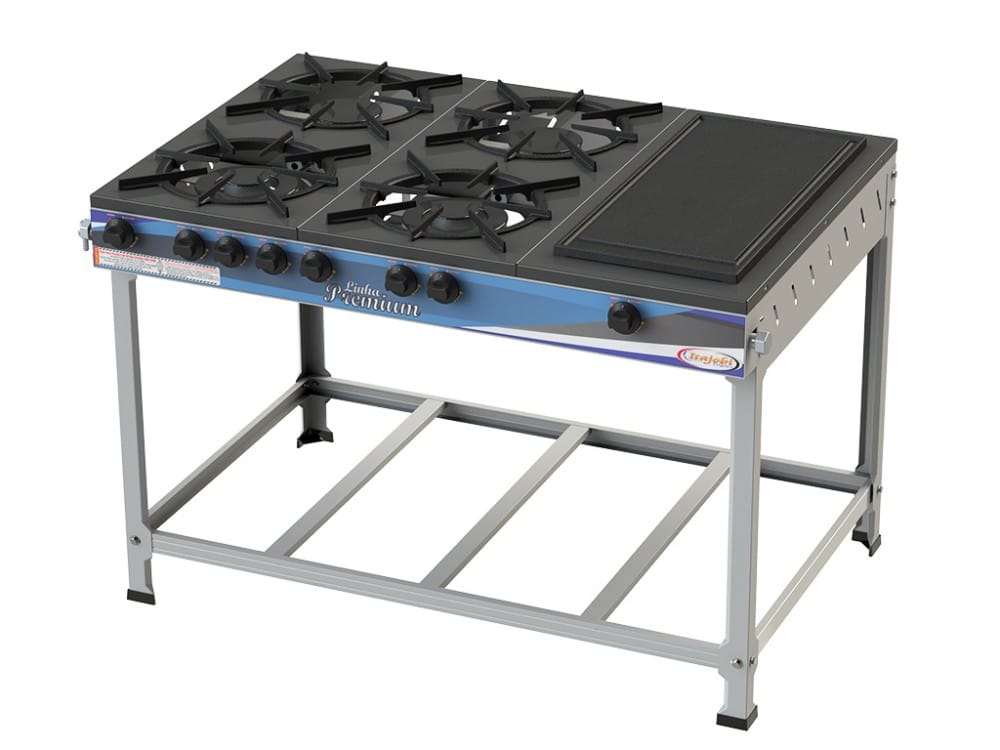 A linha de fogões Premium é fabricada em chapa de aço carbono com pintura Epóxi na cor cinza. O tampo do fogão é esmaltado.