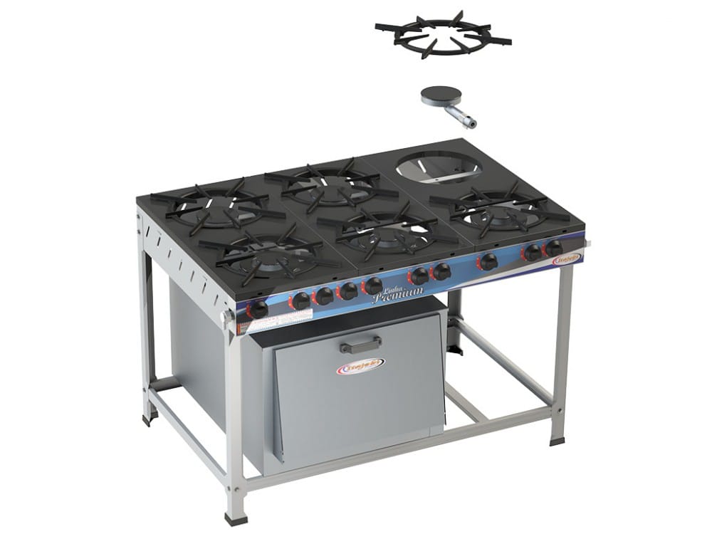 A linha de fogões Premium é fabricada em chapa de aço carbono com pintura Epóxi na cor cinza. O tampo do fogão é esmaltado.