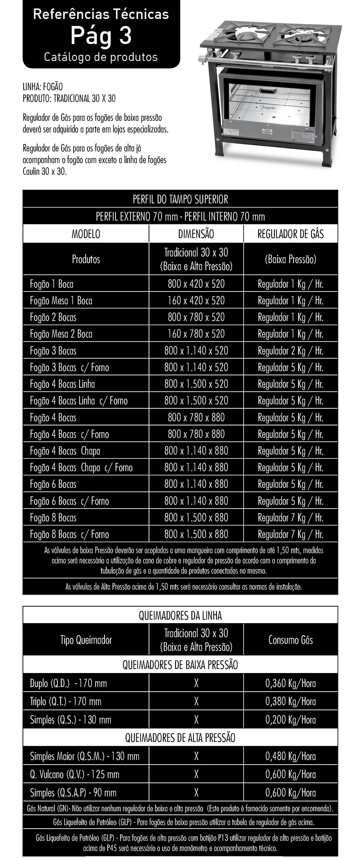 A linha de fogão Tradicional 30×30 é confeccionada em chapa de aço carbono com pintura Epóxi ou em chapa aço inox 430. Seus queimadores são fabricados em ferro fundido nos modelos de Q. Simples, Q. Duplo e Q. Triplo, nos modelos de Baixa Pressão e Q. Simples, Q. Simples Maior,  Q. Vulcano e Q. StarLine nos modelos de Alta Pressão. As grelhas são confeccionadas em ferro fundido e apresentam o formato de 8 dedos, 30×30. Esta linha apresenta o tubo coletor de gás zincado e bandeja coletora de resíduos. O recorte de suas bocas é feito de forma quadrada. Estes fogões apresentam modelos de 1 à 8 bocas, com opção de forno, chapa e banho maria.