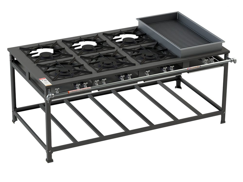 A linha de fogão Tradicional 40×40 é confeccionada em chapa de aço carbono com pintura Epóxi ou em chapa aço inox 430. Seus queimadores são fabricados em ferro fundido nos modelos de Q. Simples, Q. Duplo, Q. Triplo e Q. Gigante nos modelos de baixa pressão e Q. Simples, Q. Simples Maior, Q. Vulcano e Q. Star Line nos modelos de alta pressão. As grelhas são confeccionadas em ferro fundido e apresentam o formato de 8 dedos, 40×40. Esta linha apresenta o tubo coletor de gás zincado e bandeja coletora de resíduos. O recorte de suas bocas é feito de forma quadrada. Estes fogões apresentam quantidade de 1 à 12 bocas com opção de forno, chapa e banho maria.