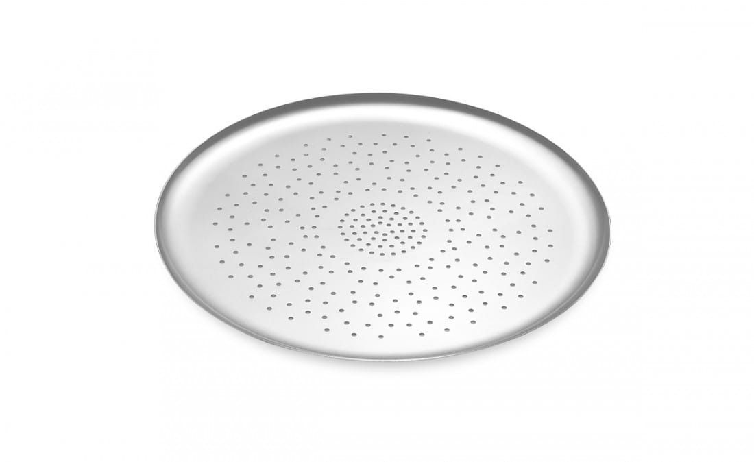 Descrição: Forma de pizza em alumínio abaulada com furos.