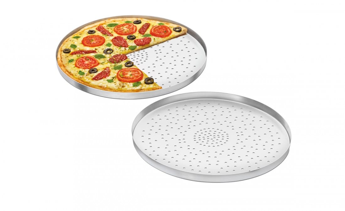 Descrição: Forma de pizza em alumínio com furos.
