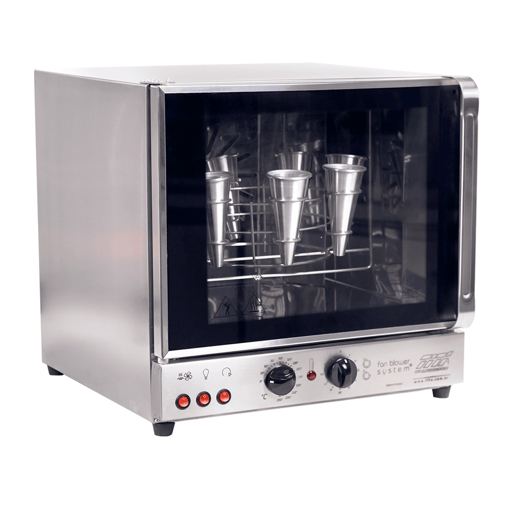Fácil de usar e ideal para espaços reduzidos, o Forno Giratório assa todos os tipos de salgados e massas congeladas. Seu sistema Turbo ligado ao sistema Giratório permite assar uniformemente os produtos, além de valorizar sua exposição. Com capacidade para assar 3 a 4 assadeiras ao mesmo tempo, gera economia e baixo consumo de energia (3000W). Feito inteiramente de aço inoxidável, com rack de aço carbono niquelado, timer que ajuda no controle do tempo e certificação INMETRO.