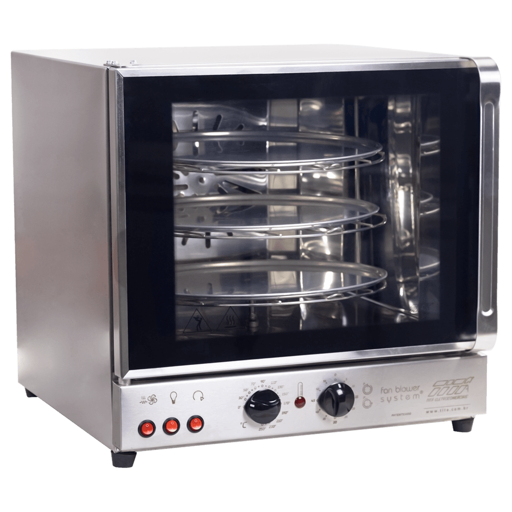 Fácil de usar e ideal para espaços reduzidos, o Forno Giratório assa todos os tipos de salgados e massas congeladas. Seu sistema Turbo ligado ao sistema Giratório permite assar uniformemente os produtos, além de valorizar sua exposição. Com capacidade para assar 3 a 4 assadeiras ao mesmo tempo, gera economia e baixo consumo de energia (3000W). Feito inteiramente de aço inoxidável, com rack de aço carbono niquelado, timer que ajuda no controle do tempo e certificação INMETRO.