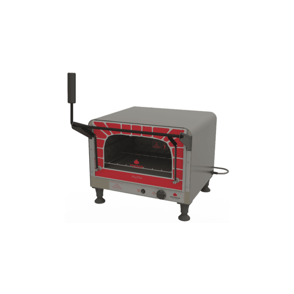 Com porta tipo guilhotina, pés antiderrapantes reguláveis, termostato e pedra refratária polida;