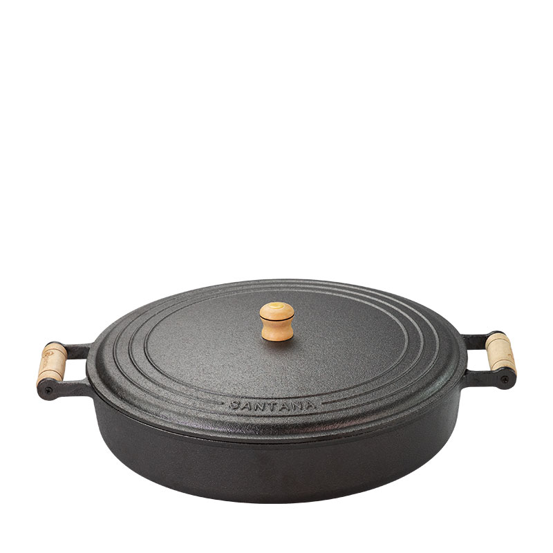 Frigideira Alta com Tampa de ferro da Santana, possui alças e batoque de madeira,  diâmetro 36 e 10 cm de altura, tornando-a extremamente versátil. Afinal, com a frigideira alta com tampa de ferro da Santana você pode cozinhar e até mesmo assar vários tipos de alimentos. Isso porque, a tampa de ferro, bastante pesada por sinal, cria um isolamento natural, fazendo uma espécie de forno, na superfície da frigideira. Esse pequeno detalhe, além de garantir que a frigideira alta com tampa de ferro mantenha uma temperatura ainda mais alta, faz com que o alimento seja cozido com seu próprio vapor, deixando-o ainda mais saboroso. Assim, você pode usar a frigideira alta com tampa de ferro para cozinhar carnes, ovos, legumes, entre outros alimentos. Além disso, ela também é uma ótima opção, se você deseja fazer seu alimento grelhado.