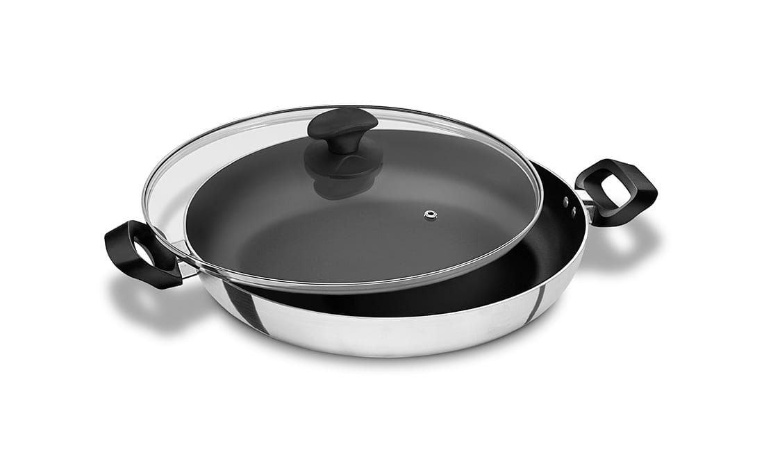 Descrição: Frigideira em alumínio revestido com 5 camadas de antiaderente, com asa de baquelite.
