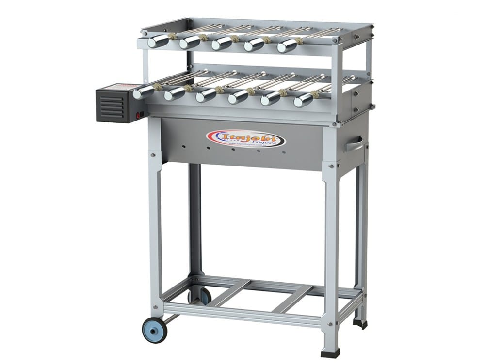 LINHA STANDARD – Corpo em chapa aço carbono com pintura époxi eletrostática cinza grafite com capa frontal dos espetos em aço inox.