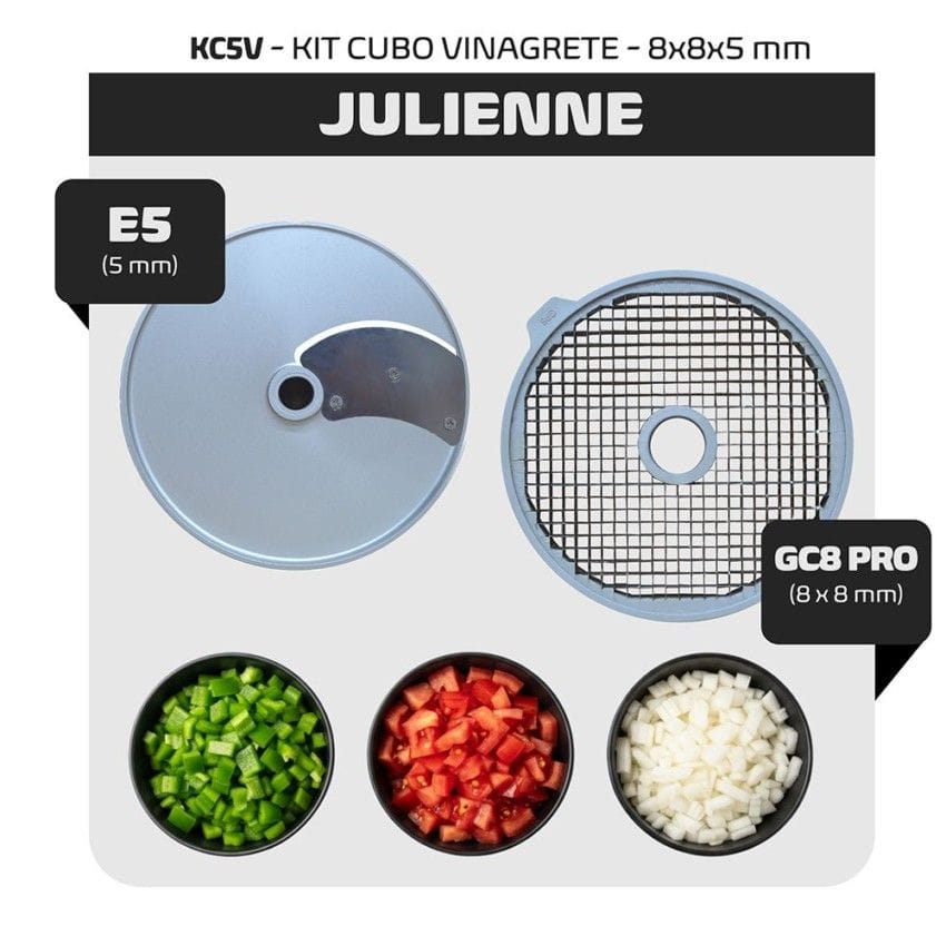 O KC5V é o kit essencial para quem busca praticidade e precisão no preparo de vinagretes e outros acompanhamentos frescos. Composto pela grade GC8 PRO de 8x8mm e o disco de corte E5 de 5mm, este kit permite cortes uniformes de 8x8x5mm em ingredientes como cebola, tomate e pimentões. Essa combinação garante cubos perfeitamente proporcionais, ideais para a produção de vinagrete com aspecto profissional.
