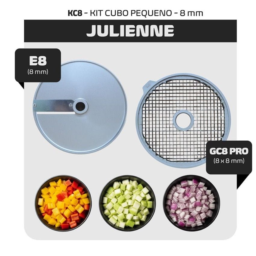 O KC8 é um Kit Cubo Pequeno de 8mm que torna o corte de legumes uma tarefa rápida e fácil. Se você precisa picar cenoura, batata, chuchu ou abobrinha, ele é a ferramenta certa! Com a grade GC8 PRO de 8x8mm e o disco de corte E8 de 8mm, você garante cortes precisos e uniformes, perfeitos para deixar suas saladas e guarnições bem apresentáveis.