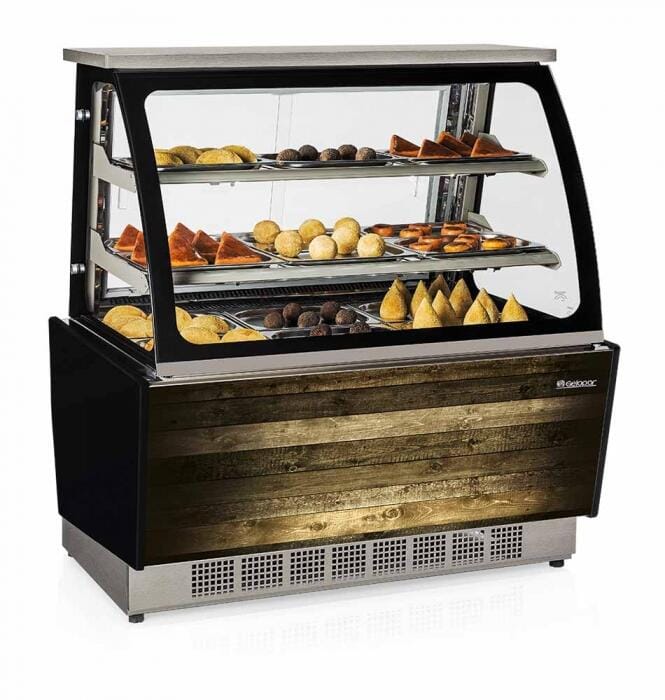 Vidro frontal articulável, curvo e temperado, com serigrafia, oferecendo fácil acesso e visibilidade dos salgados.