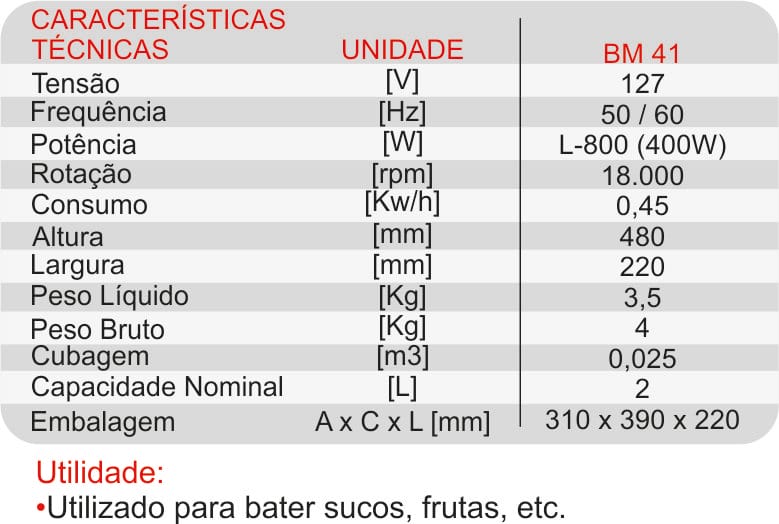 LIQUIDIFICADOR ALTA ROTAÇÃO 2 LITROS L800 (127V) – BM 41 BERMAR