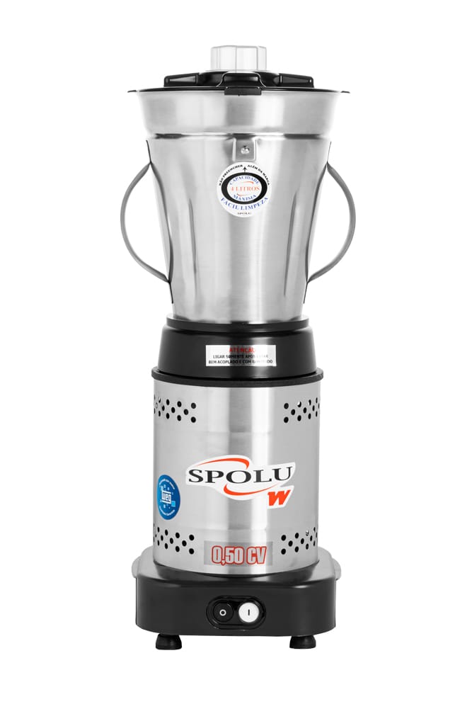 Liquidificador 4 litros baixa rotação W Spolu. Possui corpo em inox, base em polipropileno preto, copo em inox (com solda, inquebrável e resistente a choques térmicos) e tampa atóxica com visor. Liquidifica, mistura e tritura, possui interruptor liga e desliga com contatos separados, lâminas com ângulos diferenciados que permitem maior movimentação do produto e melhor processamento, possui sistema de segurança que impede a queima do motor, além de base quadrada com alças de transporte e pés antiderrapantes.