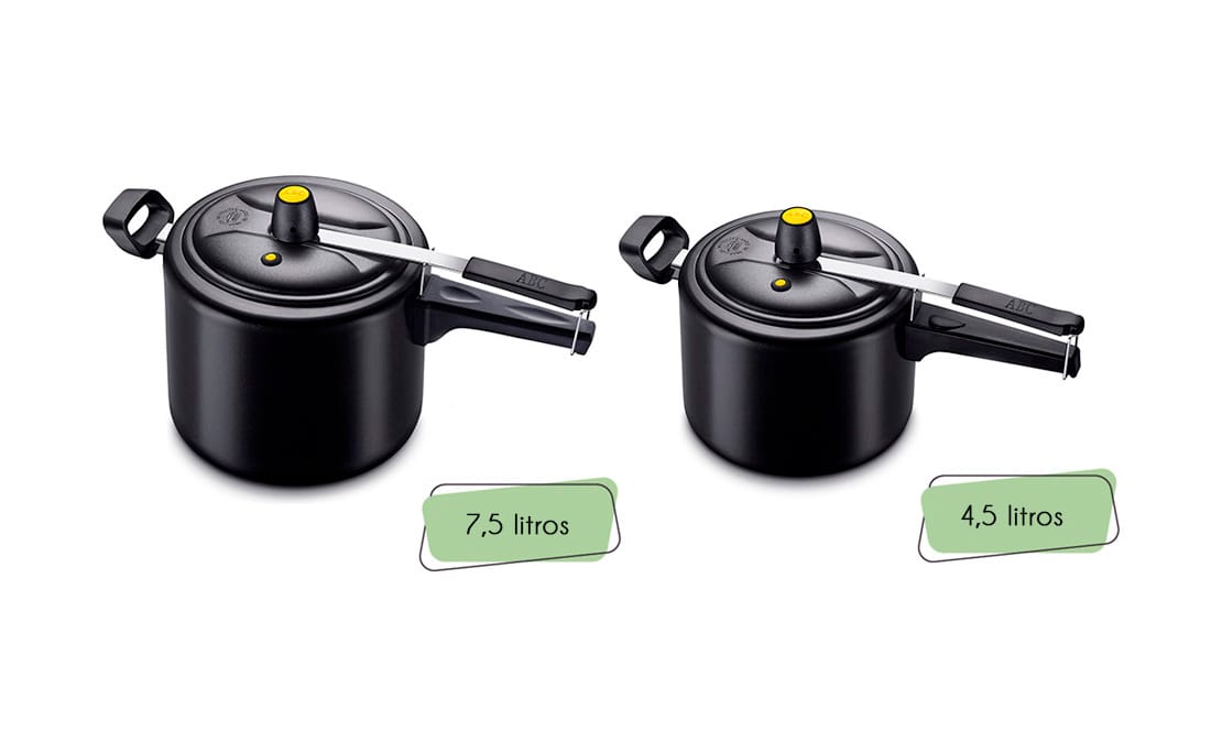 Descrição: Panela de pressão em alumínio revestido com 5 camadas de antiaderente, com fechamento interno e cabo de baquelite, possui válvula de segurança, pino de saída de vapor e anel de vedação.