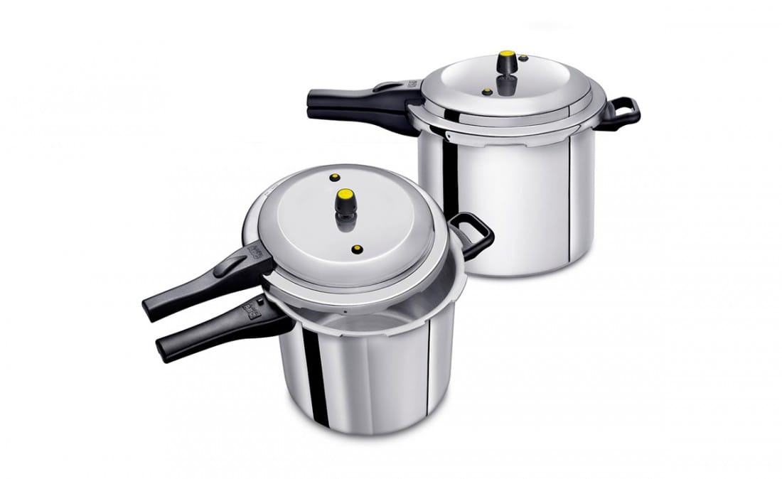 Descrição: Panela de pressão em alumínio polido com fechamento externo e cabo de baquelite, possui válvula de segurança, pino de saída de vapor, anel de vedação e travas de segurança.