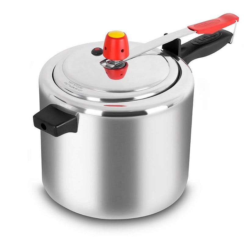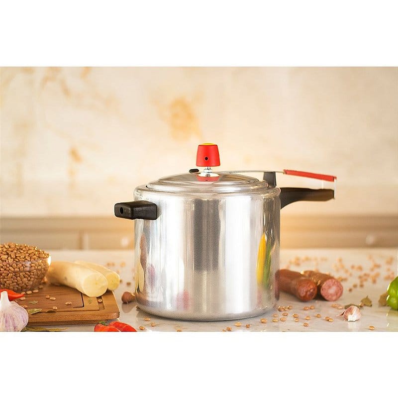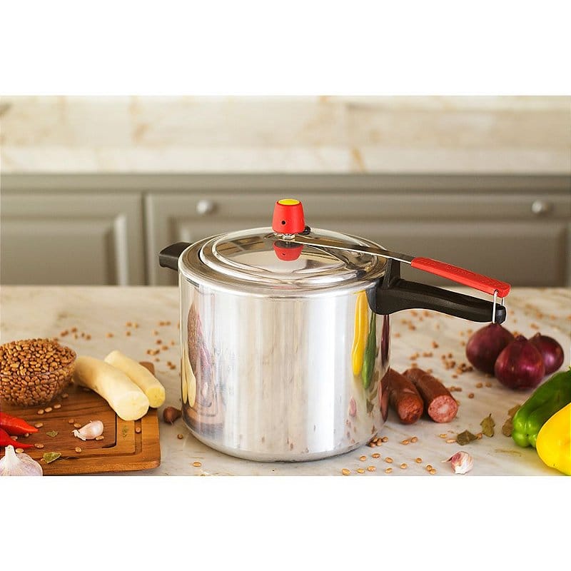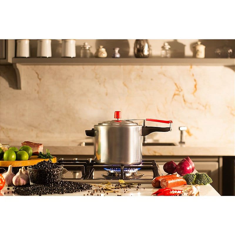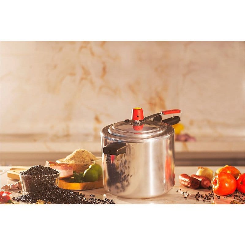A panela de pressão possui fechamento interno com borracha de vedação e válvula de silicone que garante extrema segurança para o manuseio dos alimentos.
