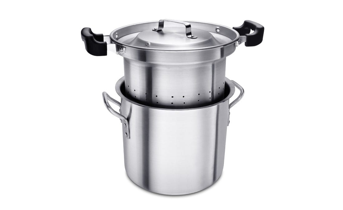 Descrição: Item 3 peças, 1 caldeirão liso com asas, em alumínio, 1 caldeirão com furos em alumínio e asas em baquelite e 1 tampa.