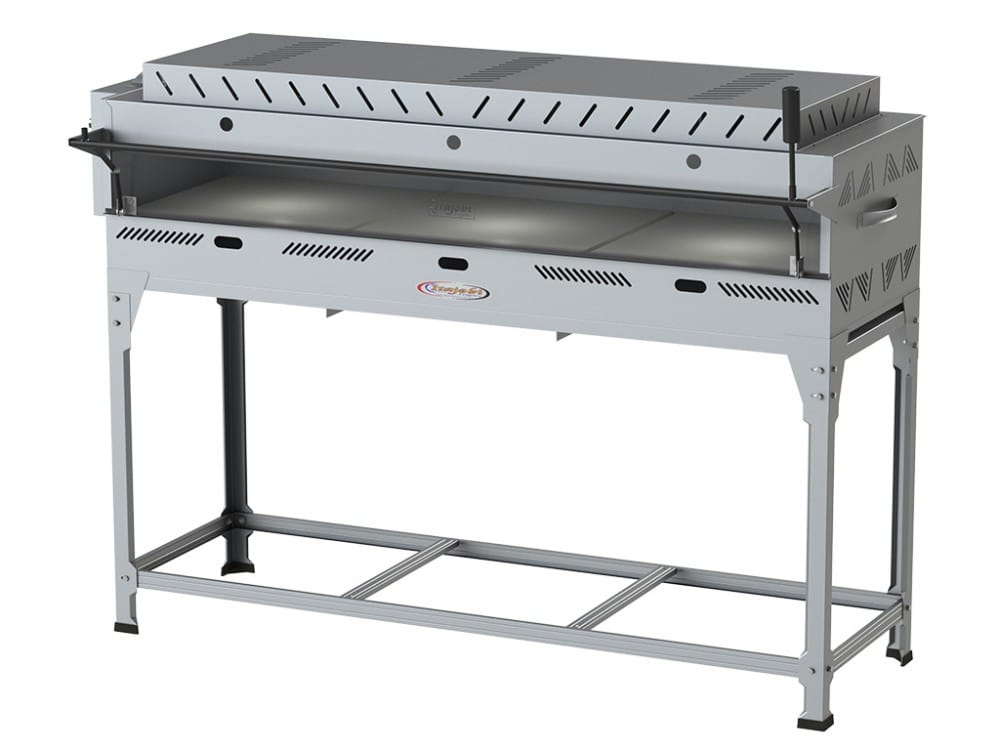 A linha Pizza Grill é um produto inovador destinado a assar pizzas com maior agilidade, sua estrutura é confeccionada em aço inox 430 para alta temperatura. O infravermelho superior é utilizado para gratinar as pizzas e o queimador inferior para aquecer a pedra refratária. A abertura do vidro é através de guilhotina e o peso para abertura possui opção de escolha do lado direito ou do lado esquerdo. A Pedra refratária pode ser giratória por motor ou por manivela ou pedra refratária fixa. O produto possui isolamento térmico na lateral de manuseio (onde há botões para controlar o infra vermelho e o queimador da pedra refratária) feito com lã de cerâmica. O produto apresenta versões para mesa ou com cavalete.
