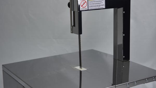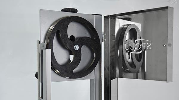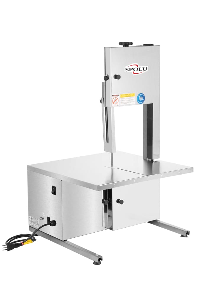Serra fita para uso doméstico ou para pequenos negócios. Com estrutura e p orta em chapa de INOX, coluna e suporte do esticador em aço carbono pintado eletrostaticamente. Volantes de ferro fundido pintados. Porta inferior e superior e aço inox com fechamento fixo. Protetor de lamina móvel facilitando a limpeza e regulagem.