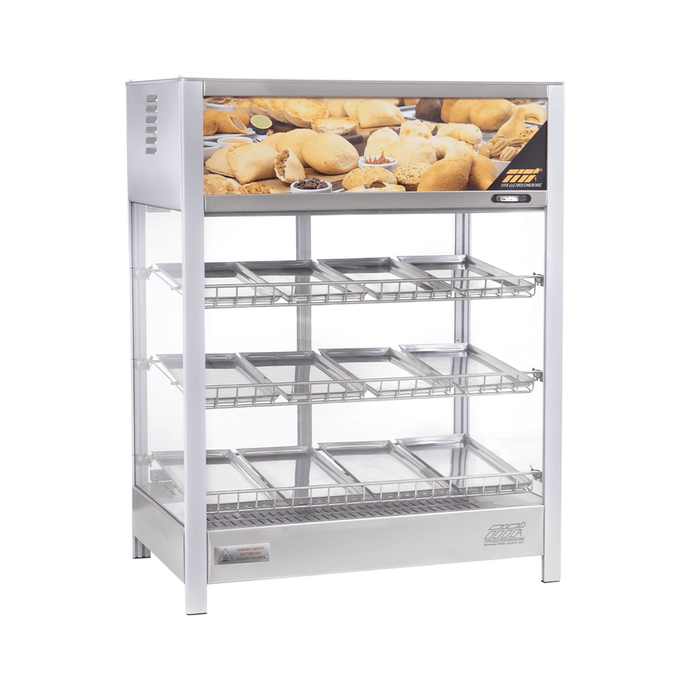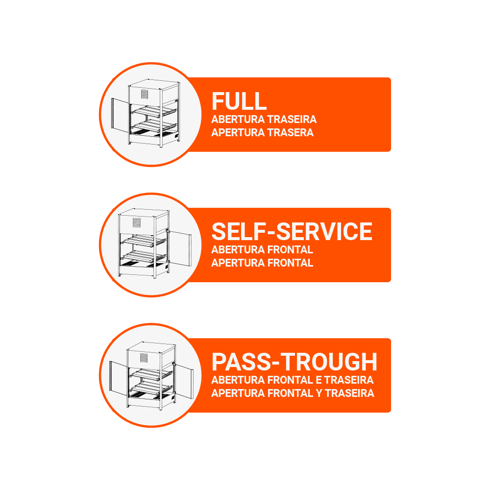 Estrutura fabricada em perfil de alumínio anodizado e aço inox; com todos os vidros temperados; bandejas em aço inox; grelha em aço carbono niquelado; termostato; termômetro analógico; iluminação LED; display com foto (exceto modelos SD – sem display); recipiente tipo gaveta para adicionar água e gerar umidade; resistência elétrica em aço inox 304 tubular; fiação elétrica com revestimento em silicone resistente a 300°C.