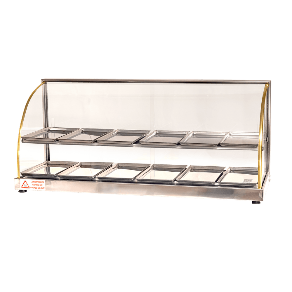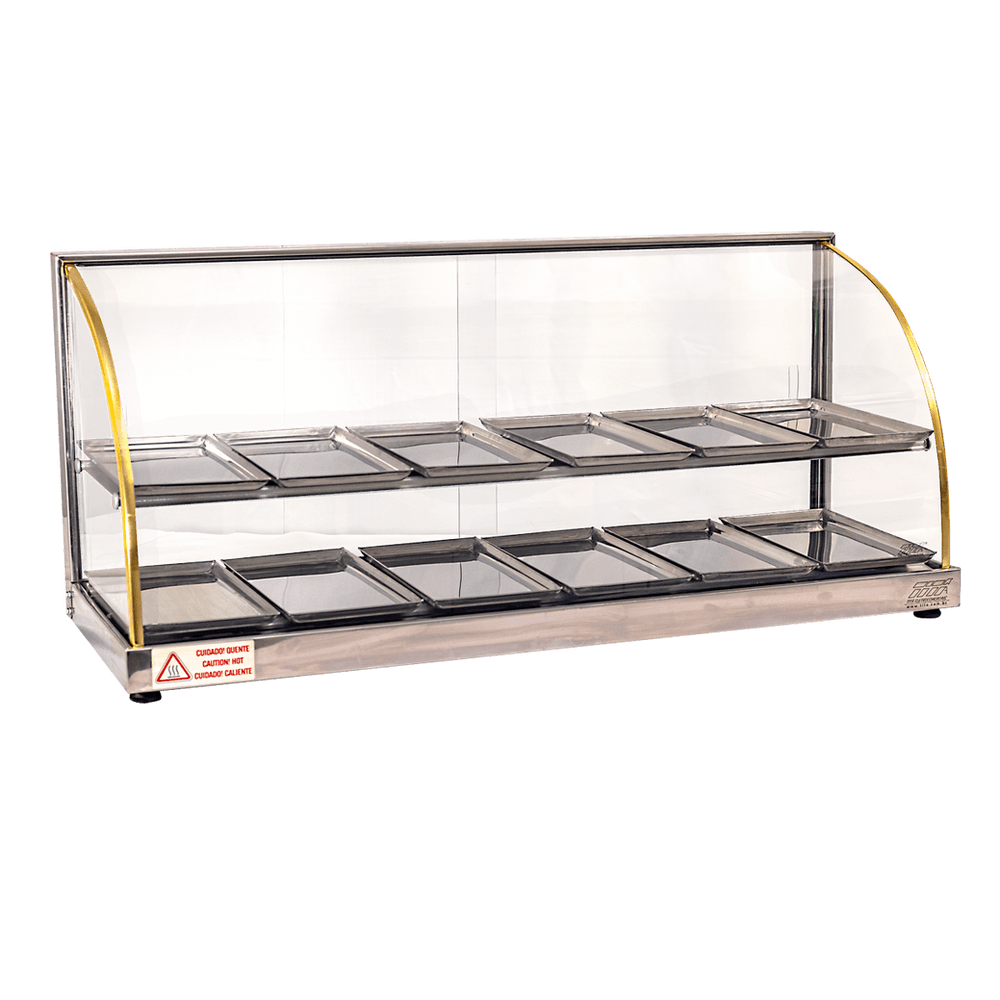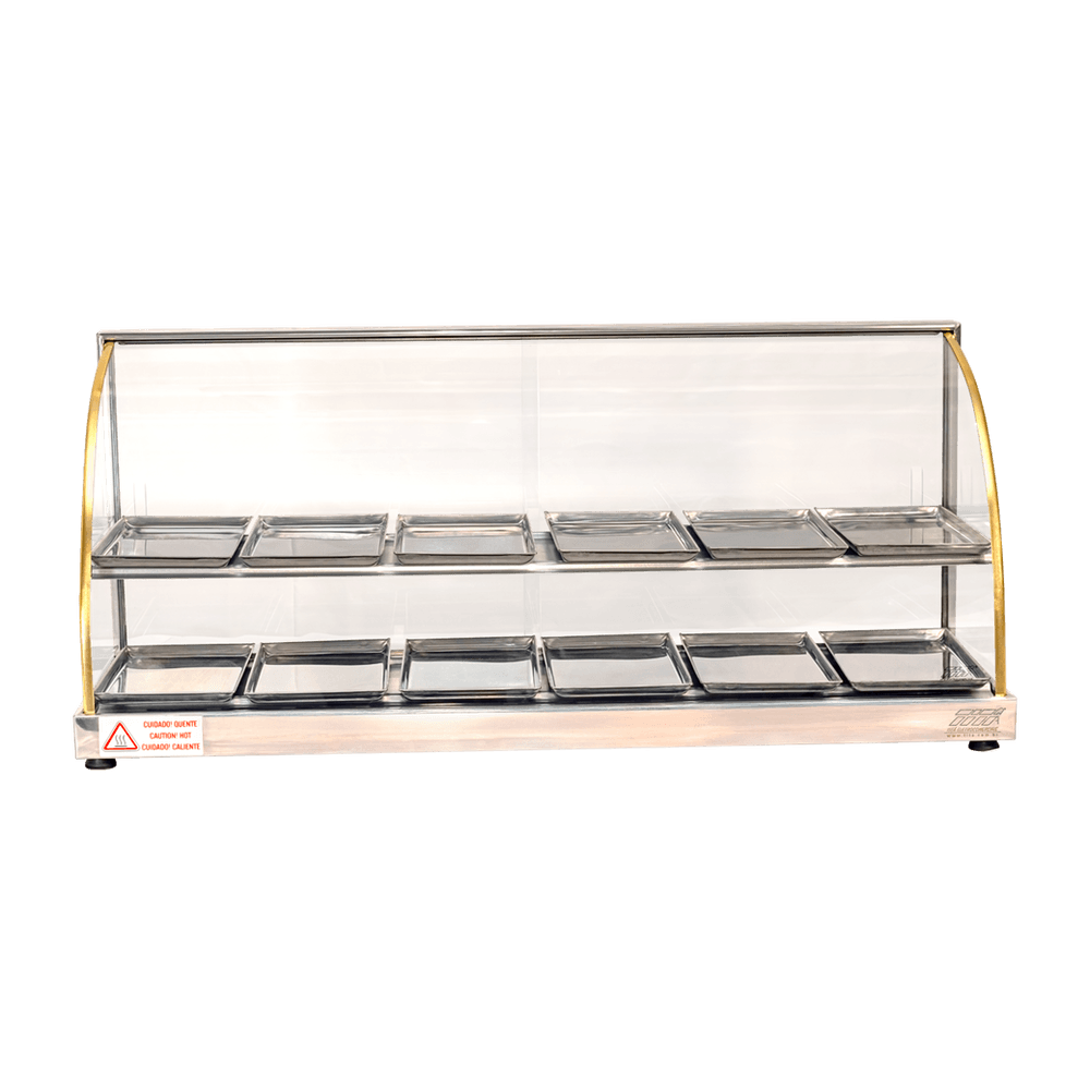 Fabricada toda em inox; com acabamento e bandejas internas em aço inox brilhante; resistência blindada; termostato e todos os vidros temperados. Não possui iluminação.