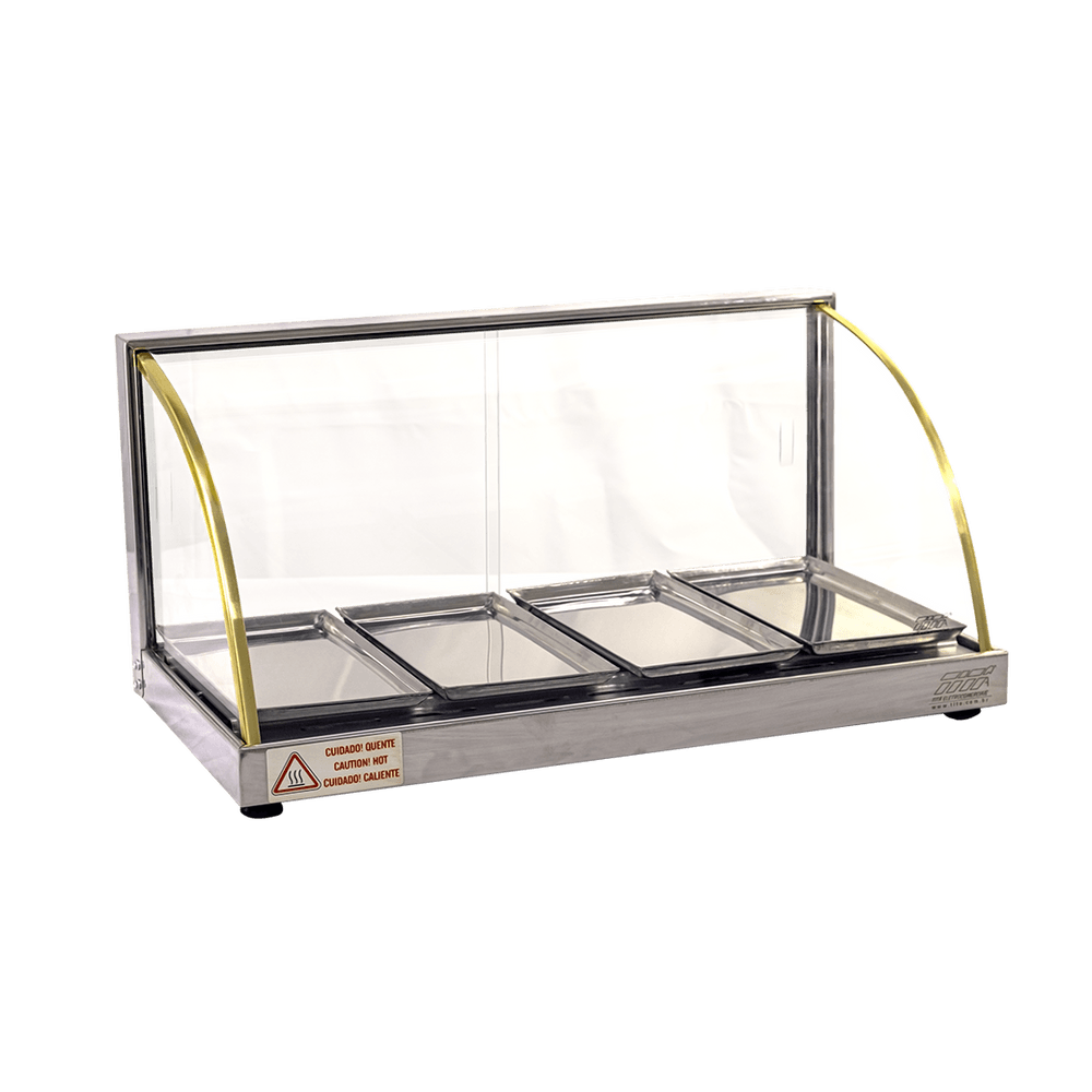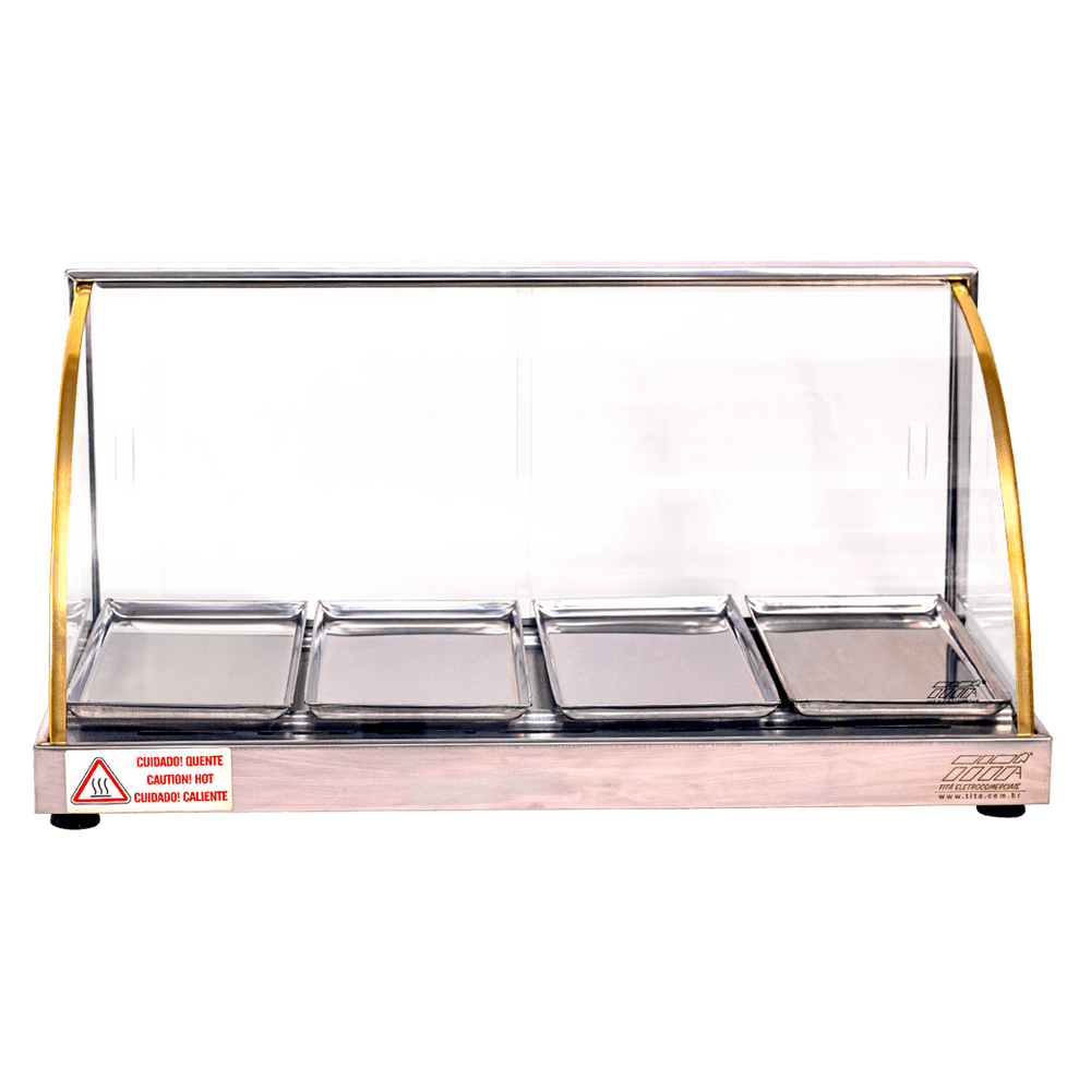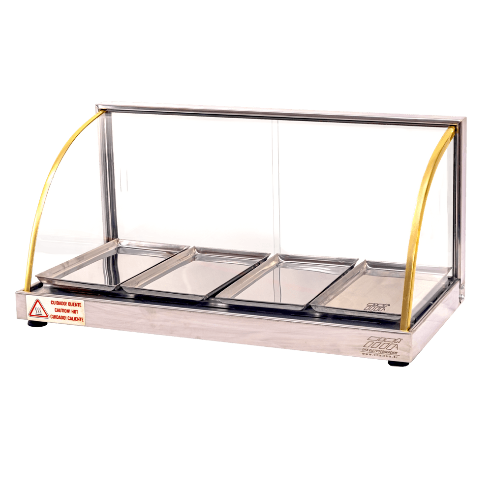 Fabricada toda em inox; com acabamento e bandejas internas em aço inox brilhante; resistência blindada; termostato e todos os vidros temperados. Não possui iluminação.