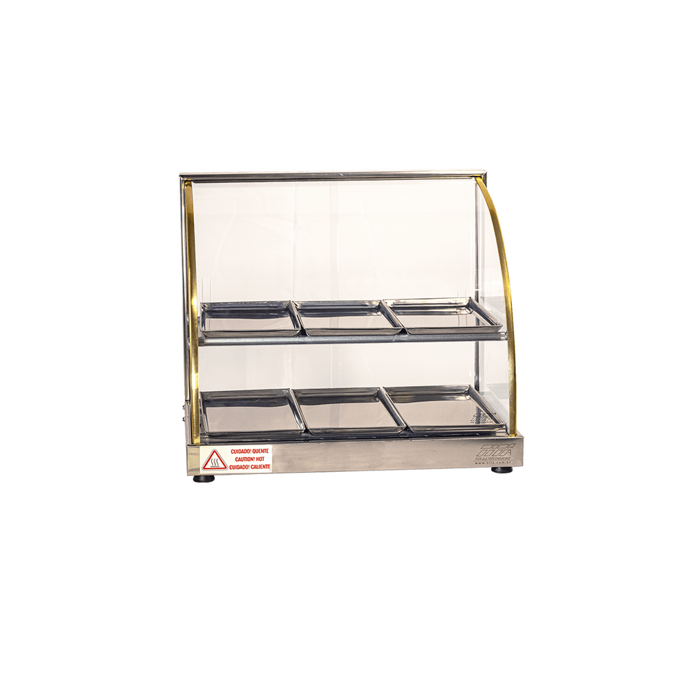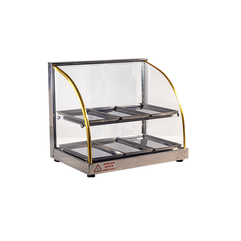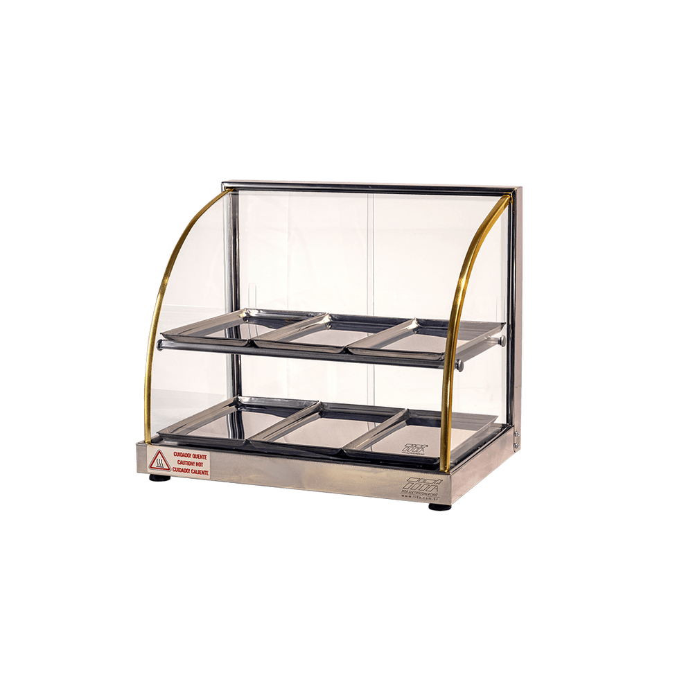 Fabricada toda em inox; com acabamento e bandejas internas em aço inox brilhante; resistência blindada; termostato e todos os vidros temperados. Não possui iluminação.